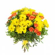 Данный букет вызовет радостную улыбку у получателя и зарядит позитивным настроением. Создан комплект из солнечных кустовых хризантем, дополненных розами нежно-персикового оттенка. Роскошную цветочную композицию можно преподнести маме, бабушке и даже коллеге в честь юбилея. Любимая девушка забудет все обиды, лишь взглянув на яркий букет.
