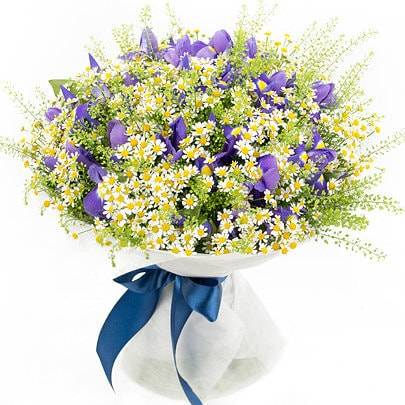 Ищете подходящий букет для искренней, открытой и уверенной в себе женщины? Тогда следует отойти от стереотипов и преподнести ей роскошную композицию из полевых цветов. Мелкие солнечные ромашки в тандеме с благородным синим ирисом станут поистине оригинальным решением. В переводе с восточного языка цветов игривая ромашка обозначает чистоту и невинность, а сладкие ирисовые ноты олицетворяют восхищение неприступной красотой и изяществом. Подарив такой букет в день рождения и по другому случаю любимой девушке или подруге, вы поделитесь с ней частицей своего тепла, нежности и любви.